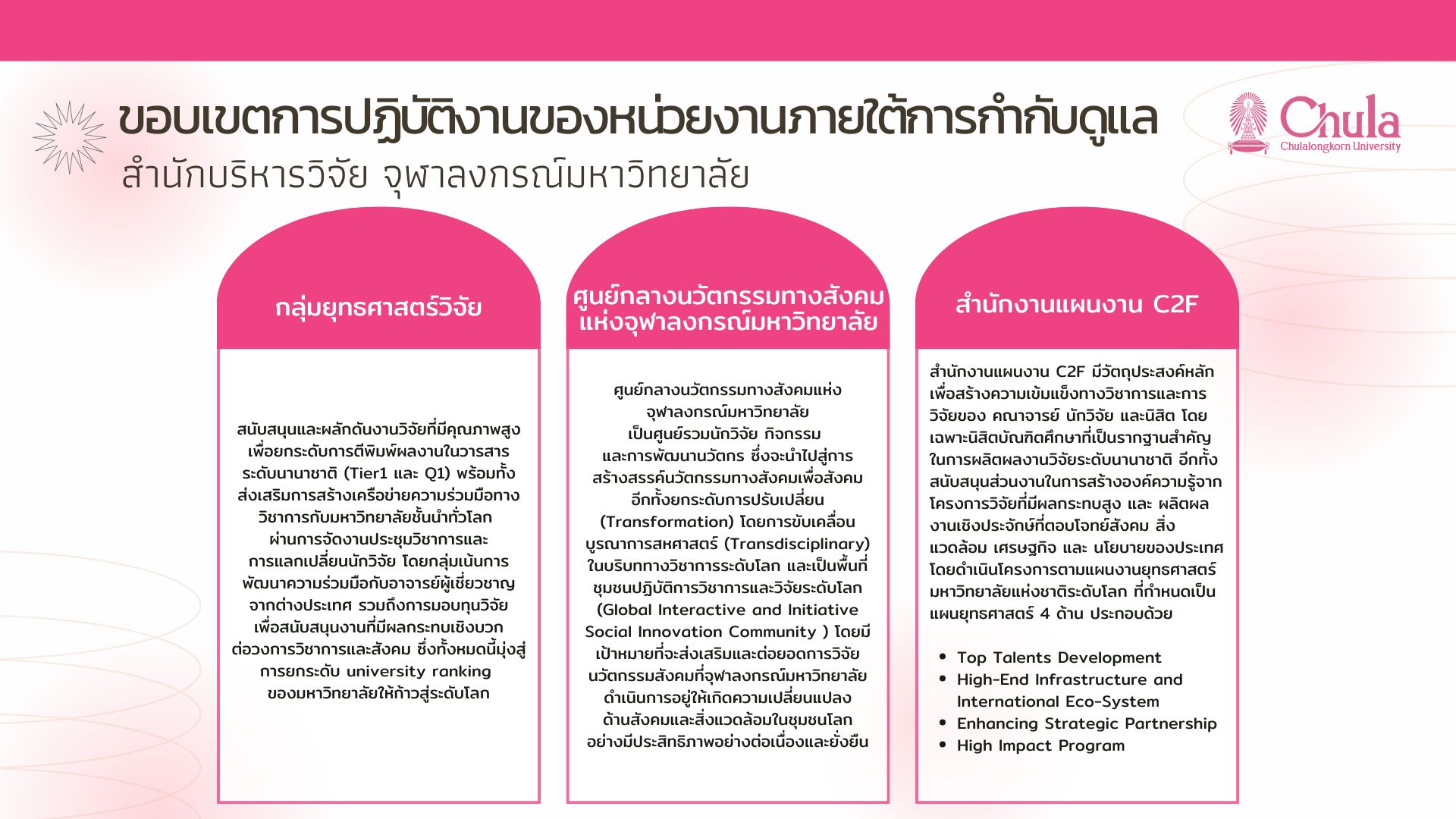 สำนักบริหารวิจัย มีภาระหน้าที่สอดคล้องกับยุทธศาสตร์ของจุฬาลงกรณ์มหาวิทยาลัยในการเป็น World Class National University โดยมุ่งให้มหาวิทยาลัย ผลิตงานวิจัยที่มีคุณภาพ สามารถนาผลงานวิจัยไปใช้ประโยชน์ต่ออุตสาหกรรม และชุมชน แก้ปัญหาของประเทศ และสร้างความเข้มแข็งแก่ระบบวิจัยของประ เทศในการพัฒนาระบบและกลไกเพื่อการพัฒนาบุคลากรด้านการวิจัยและหน่วยวิจัย การ บริหารทุนวิจัย การประเมินผลและการเผยแพร่ผลงานวิจัย ตลอดจน สนับสนุน เอื้ออานวย และให้คาปรึกษาแก่ส่วนงานและหน่วยงานต่าง ๆ