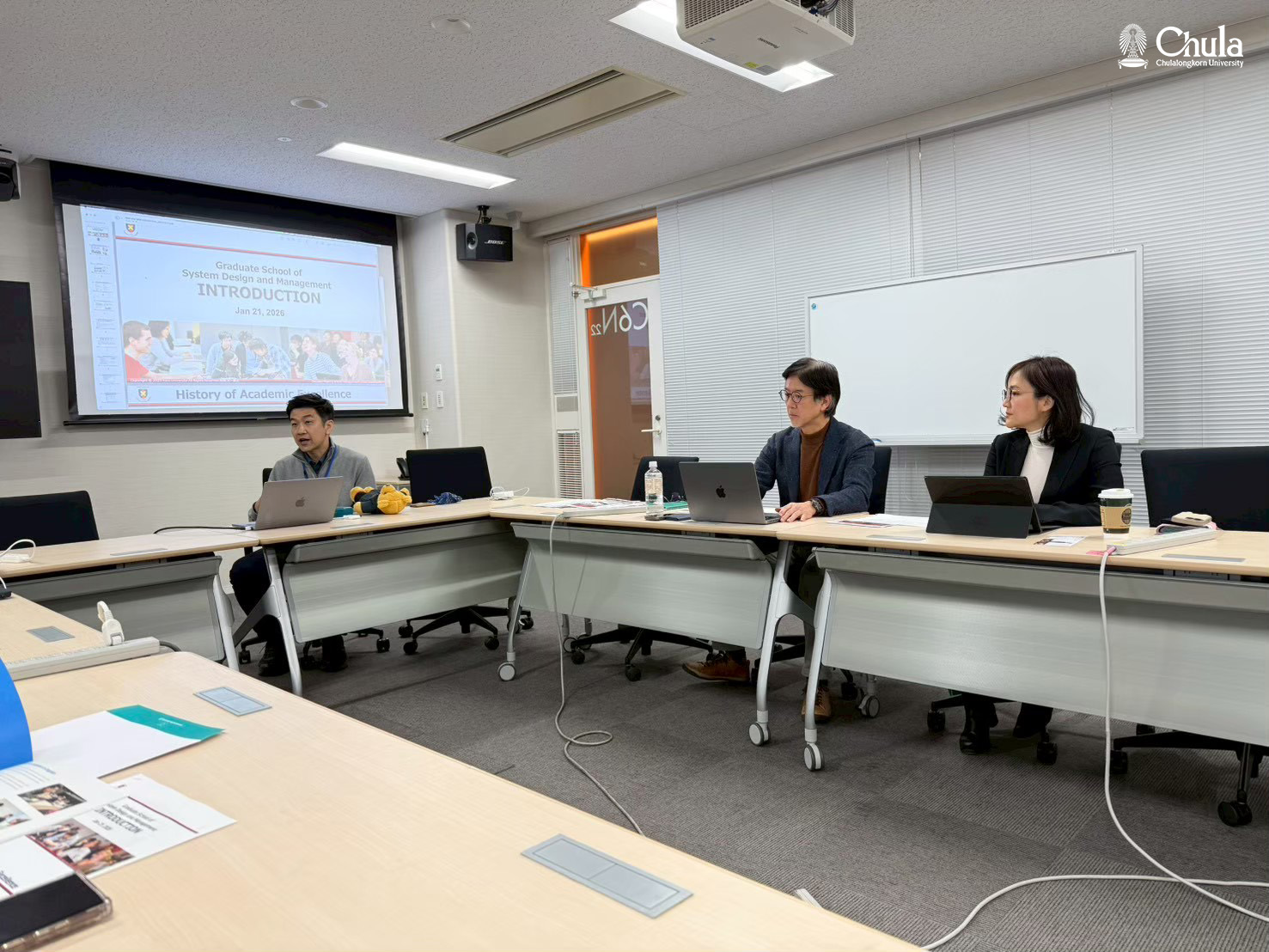 Professor Dr. Naohiko KOHTAKE, Graduate School of System Design and Management และ Professor Dr. Norihisa Miki, Vice Dean, The Faculty of Science and Technology, Keio University ให้การต้อนรับตัวแทนคณะผู้บริหารจากคณะวิศวกรรมศาสตร์ คณะสถาปัตยกรรมศาสตร์ คณะอักษรศาสตร์ และกลุ่มยุทธศาสตร์วิจัย สำนักบริหารวิจัย จุฬาลงกรณ์มหาวิทยาลัย เพื่อร่วมหารือกับผู้เชี่ยวชาญจากบัณฑิตวิทยาลัยการออกแบบและการจัดการระบบ (Keio SDM) และคณะวิทยาศาสตร์และเทคโนโลยี (The Faculty of Science and Technology) ของมหาวิทยาลัยเคโอ โดยมีวัตถุประสงค์เพื่อ ทบทวนแนวทางการเรียนรู้แบบสหวิทยาการของ SDM และสรุปความร่วมมือด้านการแลกเปลี่ยนนิสิตและการประชุมเชิงปฏิบัติการร่วมกันในช่วงทศวรรษที่ผ่านมา นำไปสู่การวางแผนขยายผลไปสู่ข้อตกลงความร่วมมือระดับมหาวิทยาลัย (University-wide Agreement) เพื่อรองรับโครงการวิจัยและการแลกเปลี่ยนในอนาคต
