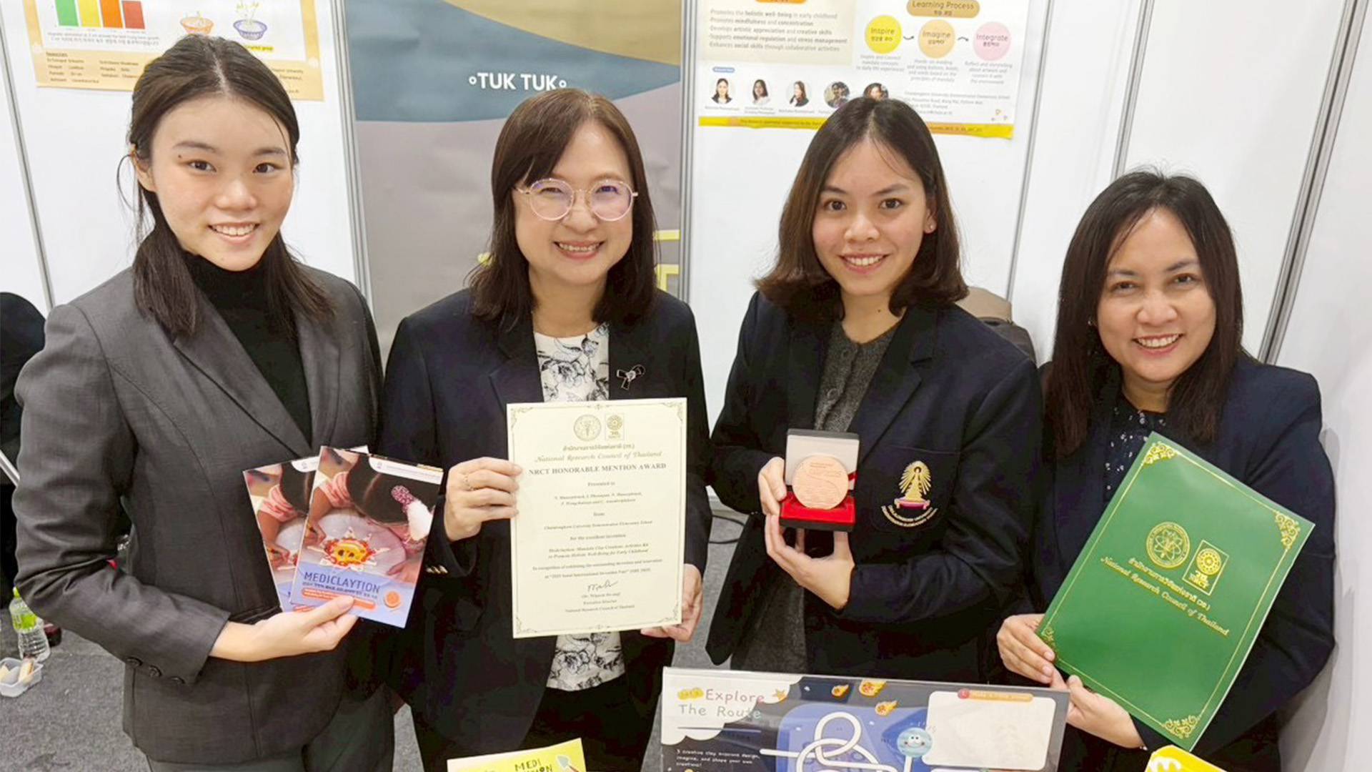 - คุณณัฐณิชา มณีพฤกษ์ ผู้ช่วยศาสตราจารย์ ดร.อินทิรา พรมพันธุ์ และคณะ จากคณะครุศาสตร์ ผลงานเรื่อง “Medication: Mandala Clay creations Activities Kit to Promote Holistic Well-Being for Early Childhood ชุดกิจกรรมการปั้นมันดาลาเพื่อเสริมสร้างสุขภาวะองค์รวมสำหรับเด็กปฐมวัย” นวัตกรรมสำหรับเด็กปฐมวัยที่เป็นการบูรณาการศาสตร์ทางด้านศิลปศึกษาเข้ากับหลักการมันดาลา ส่งเสริมให้เด็กได้ฝึกสติสมาธิและเกิดสุนทรียะผ่านการสร้างสรรค์งานศิลปะแบบปั้น โดยได้รับรางวัล Bronze Medal เป็นผลงานจากงานวิจัยและนวัตกรรมที่ได้รับทุนจาก CU Social Innovation Hub