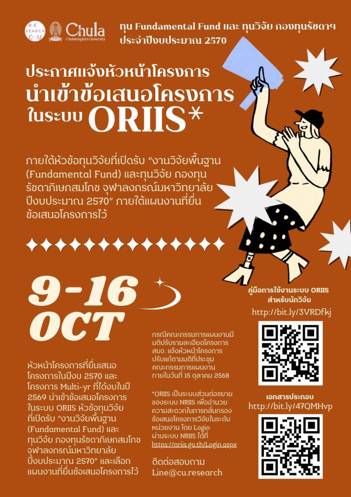 ตุลาคม 9, 2025 2025-10-09 21:55สบจ.แจ้งหัวหน้าโครงการนำเข้าข้อเสนอ ทุน FF70 ในระบบ ORIIS*