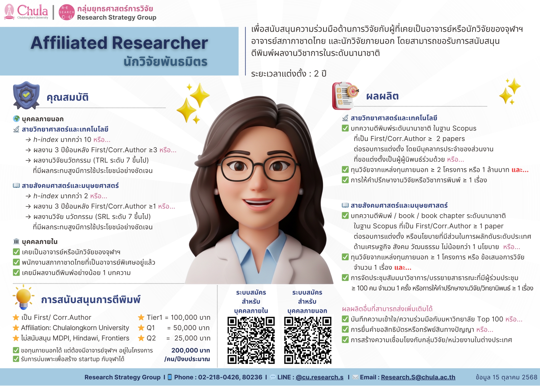 เพื่อสนับสนุนความร่วมมือด้านการวิจัยกับผู้ที่เคยเป็นอาจารย์หรือนักวิจัยของจุฬาฯ อาจารย์สภากาชาดไทย และนักวิจัยภายนอก โดยสามารถขอรับการสนับสนุน ตีพิมพ์ผลงานวิชาการในระดับนานาชาติ