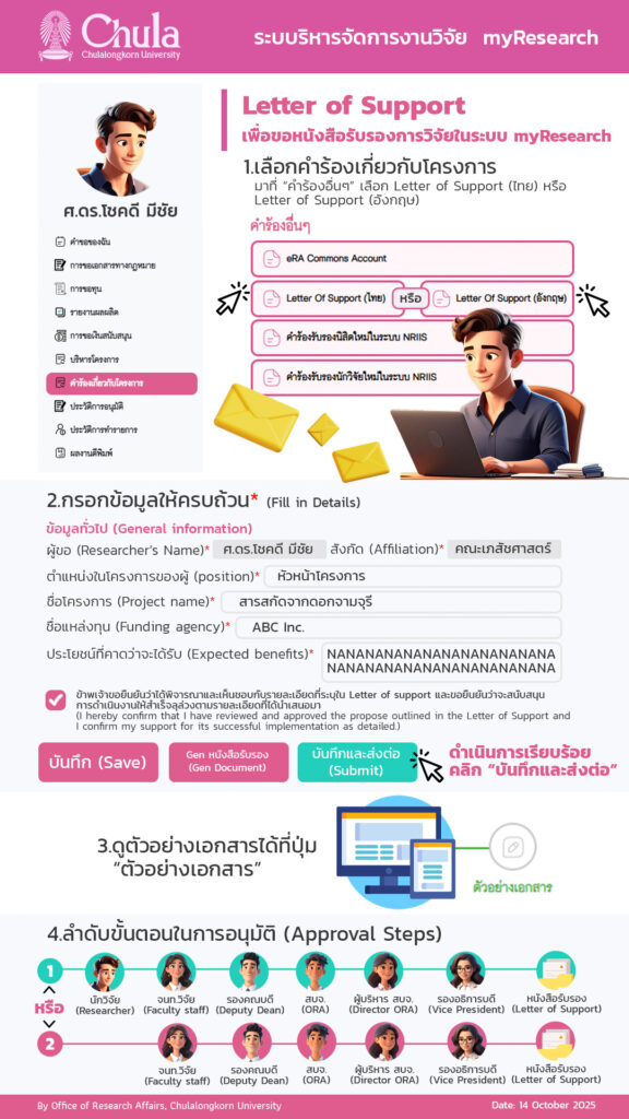 สำนักบริหารวิจัย อัพเดทฟังก์ชันใหม่ในระบบ myResearch สำหรับการขอหนังสือรับรองสนับสนุนการวิจัย เพื่อยื่นเอกสารไปยังแหล่งทุนภายนอก