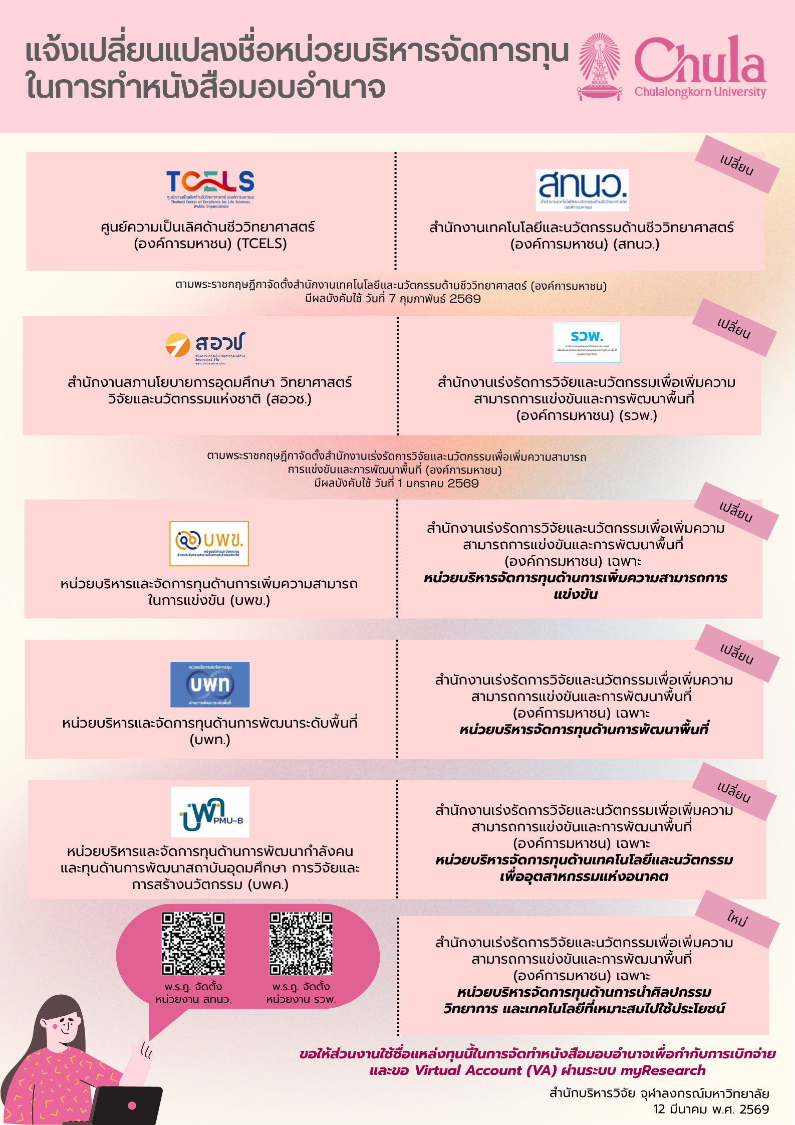 สำนักบริหารวิจัย จุฬาฯ ขอแจ้งรายชื่อหน่วยบริหารจัดการทุนที่มีการเปลี่ยนแปลงและหน่วยบริหารจัดการทุนใหม่ ขอให้ทุกส่วนงานใช้ชื่อแหล่งทุนใหม่ในการจัดทำหนังสือมอบอำนาจ เพื่อกำกับการเบิกจ่ายและขอ Virtual Account (VA) ผ่านระบบ myResearch ดังนี้