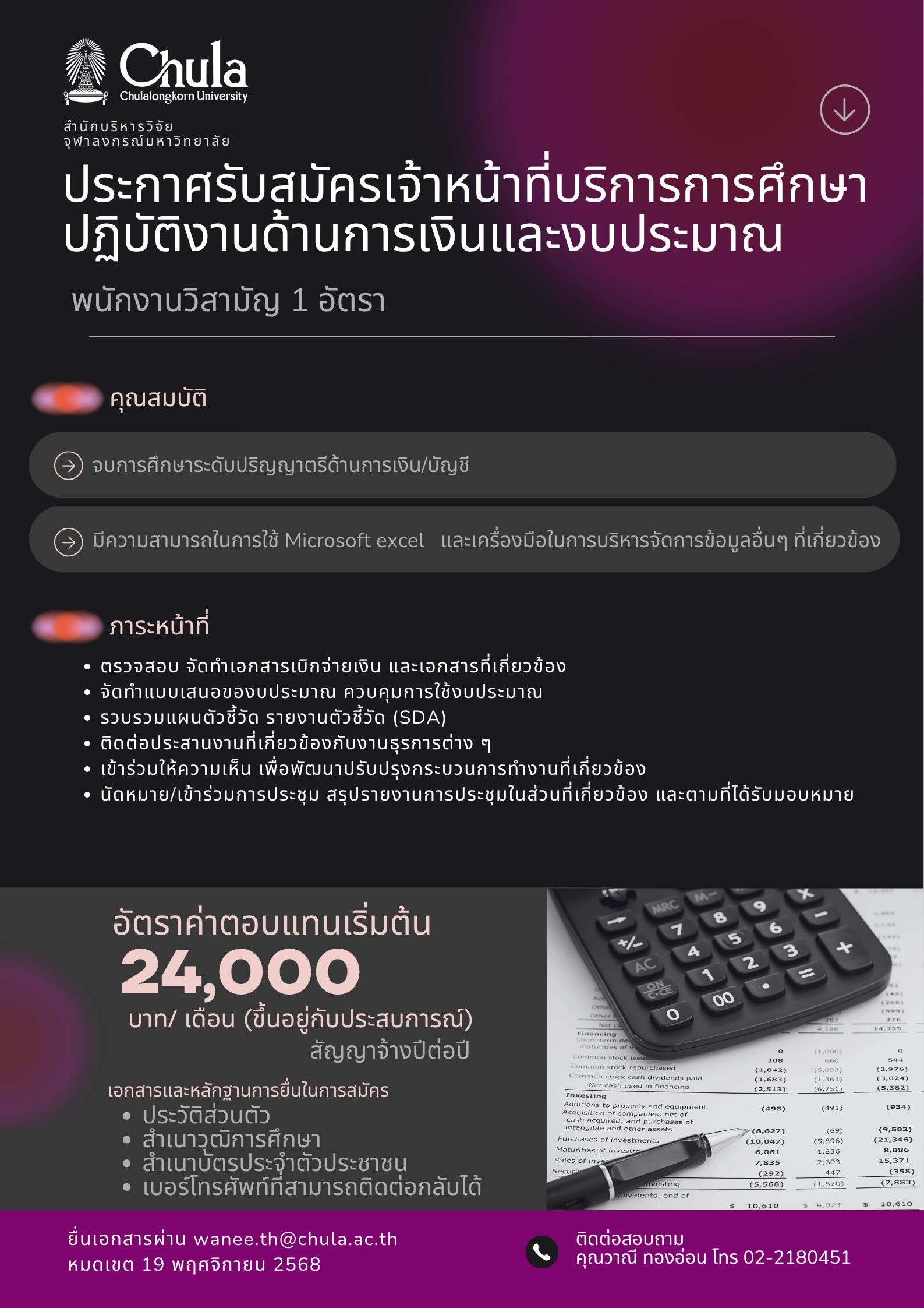 📣สำนักบริหารวิจัย ประกาศรับสมัครเจ้าหน้าที่บริการการศึกษา ปฏิบัติงานด้านการเงินและงบประมาณ (พนักงานวิสามัญ 1 อัตรา)