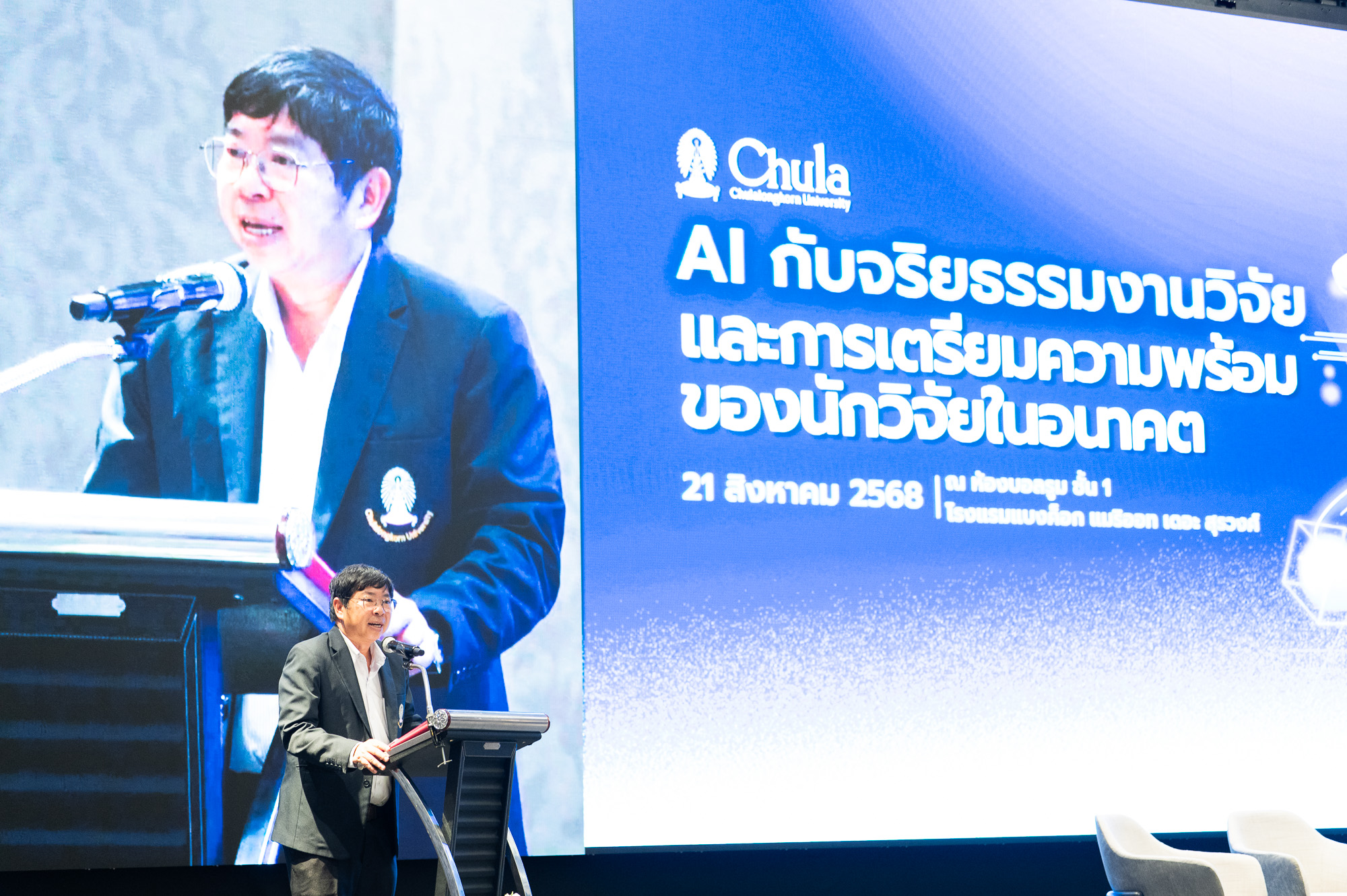 งานเสวนา “AI กับจริยธรรมงานวิจัยและการเตรียมความพร้อมของนักวิจัยในอนาคต” จัดโดยคณะกรรมการจริยธรรมงานวิชาการและงานวิจัย สำนักบริหารวิจัย จุฬาลงกรณ์มหาวิทยาลัย จัดขึ้นเพื่อส่งเสริมการสร้างความรู้และความเข้าใจเกี่ยวกับการใช้ AI ในงานวิจัยควบคู่ไปกับจริยธรรมในกระบวนการผลิตผลงาน รวมถึงเตรียมความพร้อมให้นักวิจัยรุ่นใหม่สามารถรับมือกับการเปลี่ยนแปลงทางเทคโนโลยีในโลกอนาคตได้อย่างมีประสิทธิภาพ