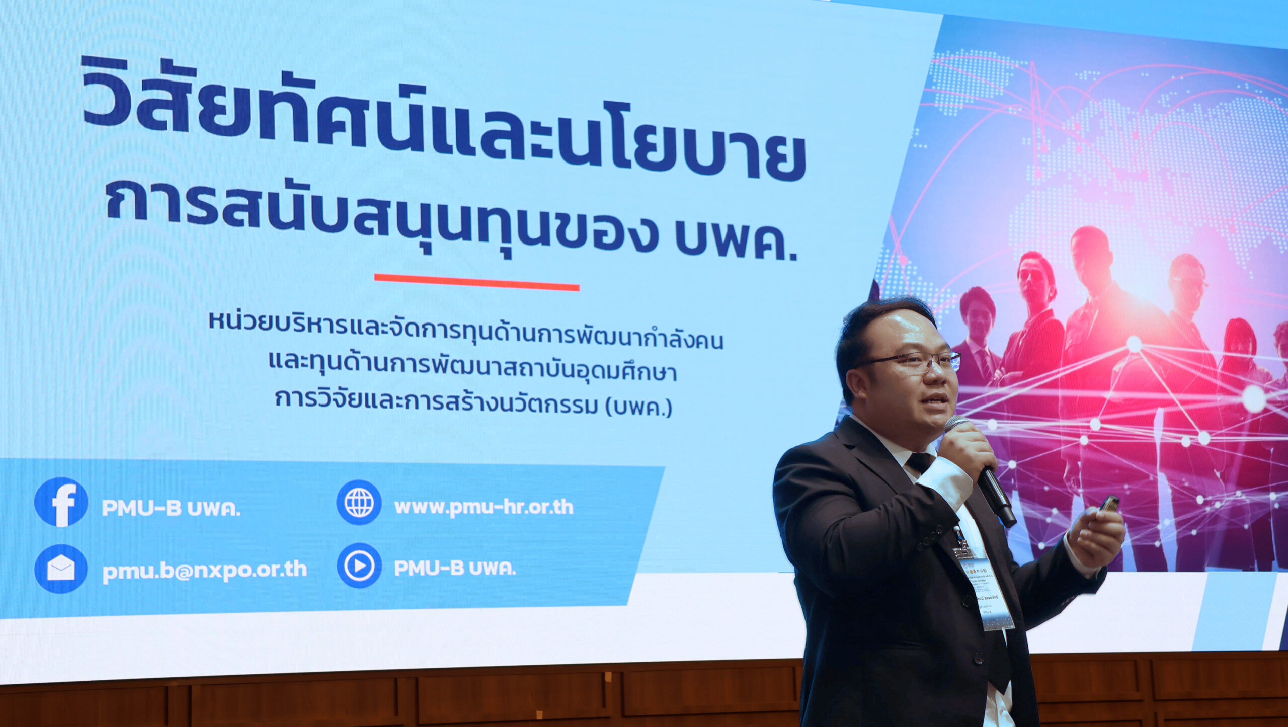นอกจากนี้ ยังได้รับเกียรติจาก ดร.ณิรวัฒน์ ธรรมจักร ผู้อำนวยการหน่วยบริหารและจัดการทุนด้านการพัฒนากำลังคนและทุนด้านการพัฒนาสถาบันอุดมศึกษาการวิจัยและสร้างนวัตกรรม (บพค.) นำเสนอวิสัยทัศน์และนโยบายการสนับสนุนทุนวิจัย และเสวนาพิเศษในหัวข้อ “ยกระดับเศรษฐกิจของประเทศด้วยวิจัยและนวัตกรรม” โดย หม่อมหลวงภาสกร อาภากร ผู้อำนวยการสำนักส่งเสริมมูลค่าเพิ่มเพื่อการค้า กรมส่งเสริมการค้าระหว่างประเทศ กระทรวงพาณิชย์ และ “Global collaboration is the way to secure and enhance country’s competitiveness” โดย Mr. Andrew Egan, Minister and deputy head of mission, Australian embassy in Bangkok Thailand